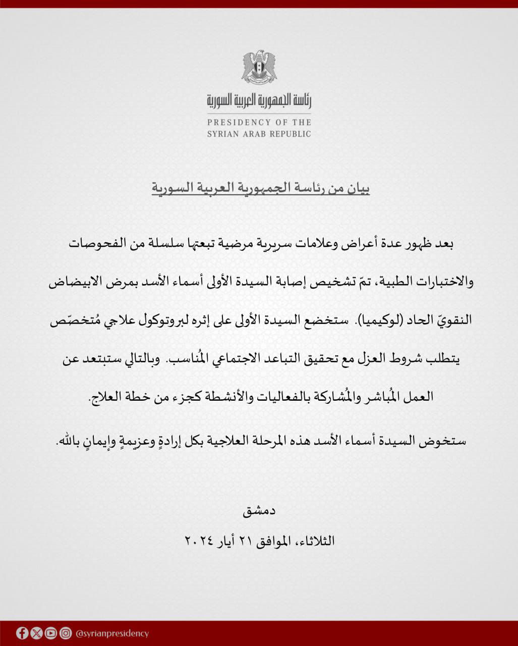 أعلنت الرئاسة السورية في بيان، أنه جرى تشخيص إصابة أسماء الأسد قرينة الرئيس بشار الأسد بسرطان الدم (لوكيميا)، وذلك بعد نحو خمس سنوات من إعلانها التعافي التام من إصابة بسرطان الثدي.